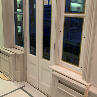 We repaired the existing sash window boxes and door frames, but had to install new sashes. New hardwood sashes with acoustic double glazed units were much heavier, which meant we had to use new sash weights, some up to 38 pounds, to accommodate the large windows. All windows and doors were installed with high performance AQ21-style seals and brush pile carriers to achieve the best sound proofing and heat loss prevention. The level of sound we measured with the old windows went from 67db to 28db with the new windows and doors. This is a big improvement!